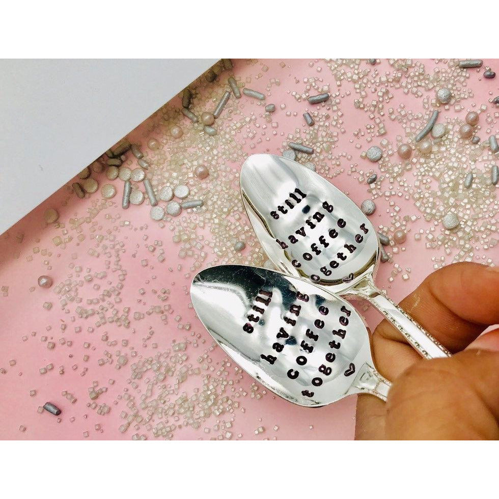All of our silverware items are silver plated, they have been treasure hunted and handpicked from local antique stores. Furthermore, after inspecting and before releasing our products into our store inventory they undergo a complex process including hand stamping, cleaning and polishing. This is not a brand new, never used, flatware. Our vintage inventory had been previously used and there may be some signs of wear. However, we hand polish and wash all these pieces before they reach our customers. Each letter has been hand stamped one by one, that is the reason why each piece is unique and meaningful. Each letter may not line up perfect, but that adds to the charm of a handmade piece! ink used to darken the letters is an edible dye but will not stay permanently and will fade overtime. Hand washing is recommended to make the black letters last longer. However, the impression will remain forever because it is stamped into the metal.To keep the shine of the silver, simply spread tarnish away with any jewelry cloth or tarnish remover.